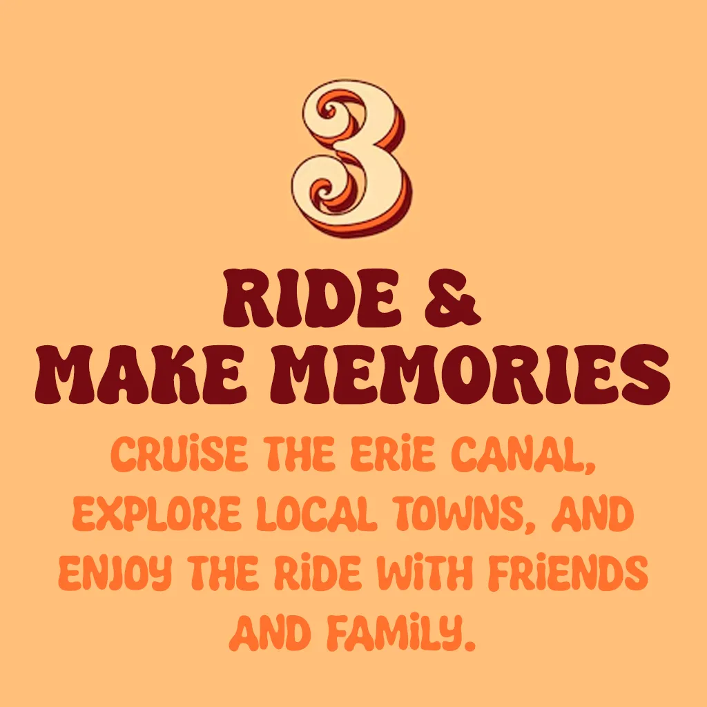 We offer electric bike rentals that make it easy—and fun—for anyone to explore the Erie Canal trail at their own pace. Whether you’re cruising with your crew, taking the kids on a mini adventure, or riding solo for some fresh air and freedom, our e-bikes are built for joyful moments and scenic memories.